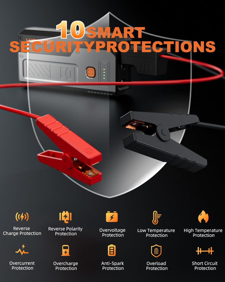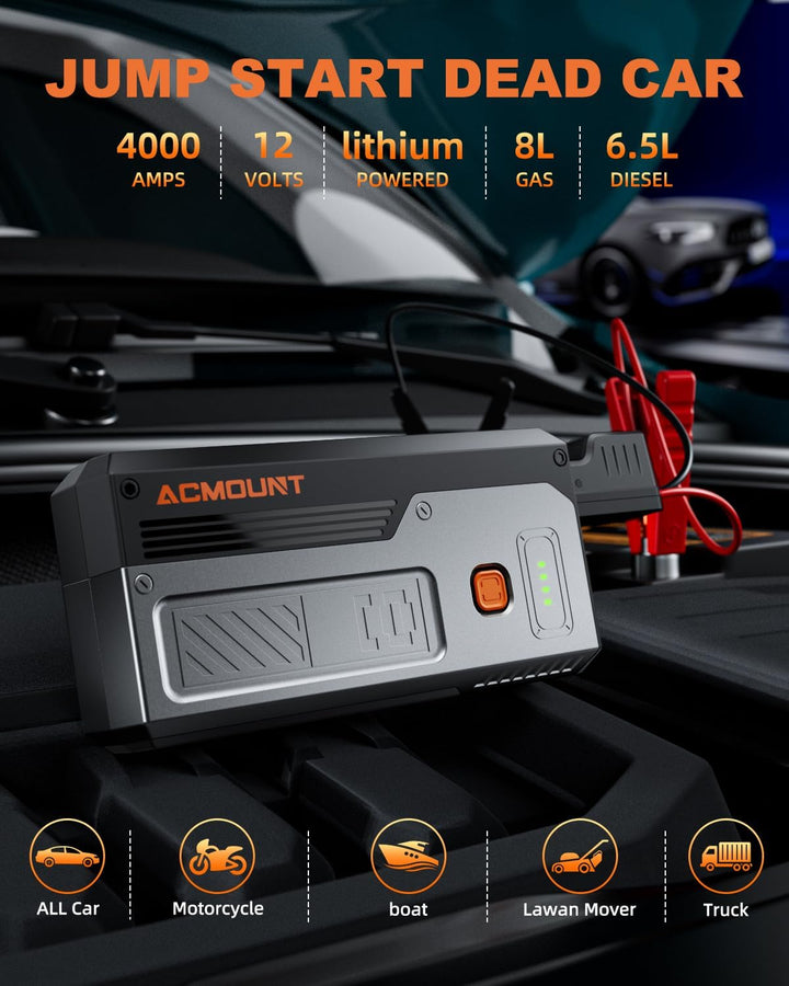- Absolutely Safe: Acmount Jump starter uses design of Integrated Battery and Intelligent Clamps, which is fully insulated and safe enough. 10 types of protection include spark-proof, reverse-polarity protection to protect you from failure problems such as short circuits or sparks.