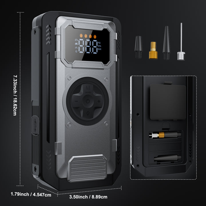 [Efficient Tire Inflator & Portable Air Compressor]: Engineered with user convenience in mind, this Acmount portable jump starter boasts a high-pressure 150PSI air pump that swiftly inflates car tires from 29 PSI to 36 PSI within just one minute. With five versatile modes (car, motorcycle, bicycle, basketball, and custom inflation) and four interchangeable nozzles, it caters to various inflation needs, be it for motorcycles, bicycles, sports equipment, or even swimming rings. Seamless unit switching between PSI, Bar, and Kpa, coupled with a detachable extension hose, enhances usability further.