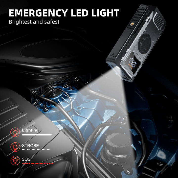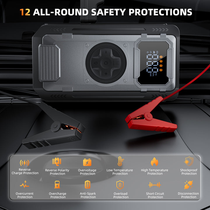 [User-Friendly Interface & Safety First]: Designed with simplicity and safety at its core, this jump starter features a clear LCD display that provides at-a-glance information on battery levels, selected inflation mode, and real-time tire pressure. One-touch buttons allow for easy mode selection, enhancing user experience. Safety is paramount; thus, ten integrated safety mechanisms safeguard against short circuits, overheating, and more, ensuring spark-free operation—perfect for users of all skill levels.