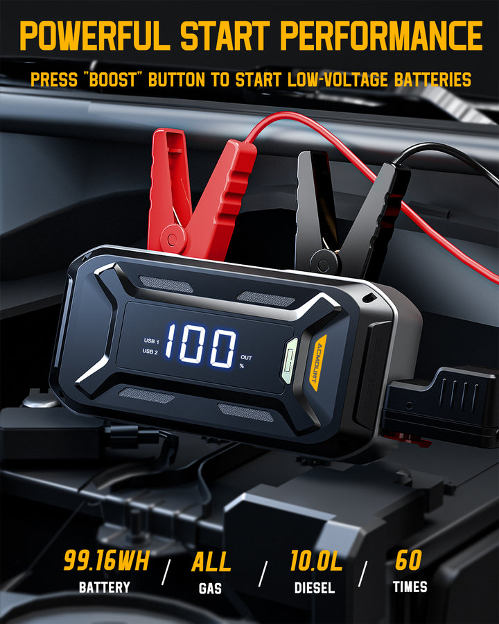 - 99.16Wh Powerful Performance - The Battery Jump Starter can jump start a dead car battery(All gas/ 10L Diesel Engine) in seconds, even if the battery voltage is too low, pressing the “BOOST” button will force the car to restart. Up to 60 jump starts on a single charge, suitable for 12v vehicles, motorcycles, pickup trucks, RVs, tractors, trucks, cargo vans, ATVs, snowmobiles, yachts and many more.